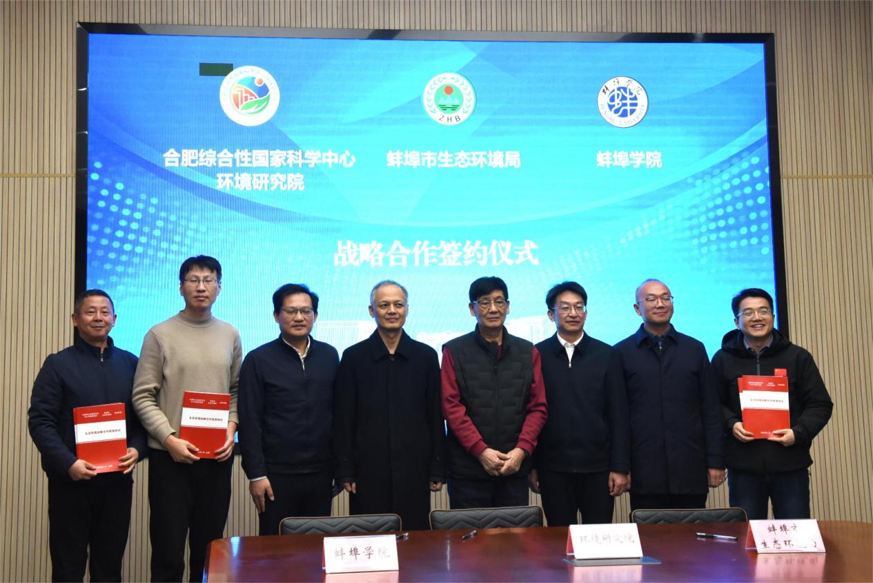 1月4日上午,合肥综合性国家科学中心环境研究院、蚌埠市生态环境局、蚌埠学院生态环境战略合作框架协议在合肥综合性国家科学中心环境研究院正式签署。中国工程院院士、环境研究院科技委主任刘文清,安徽省生态环境厅副厅长、一级巡视员罗宏,蚌埠学院校长张亚新,蚌埠市生态环境局党组书记、局长陈伟出席仪式并致辞。党委委员、纪委书记、监察专员杨安成及有关部门、学院主要负责同志见证了签约仪式。
