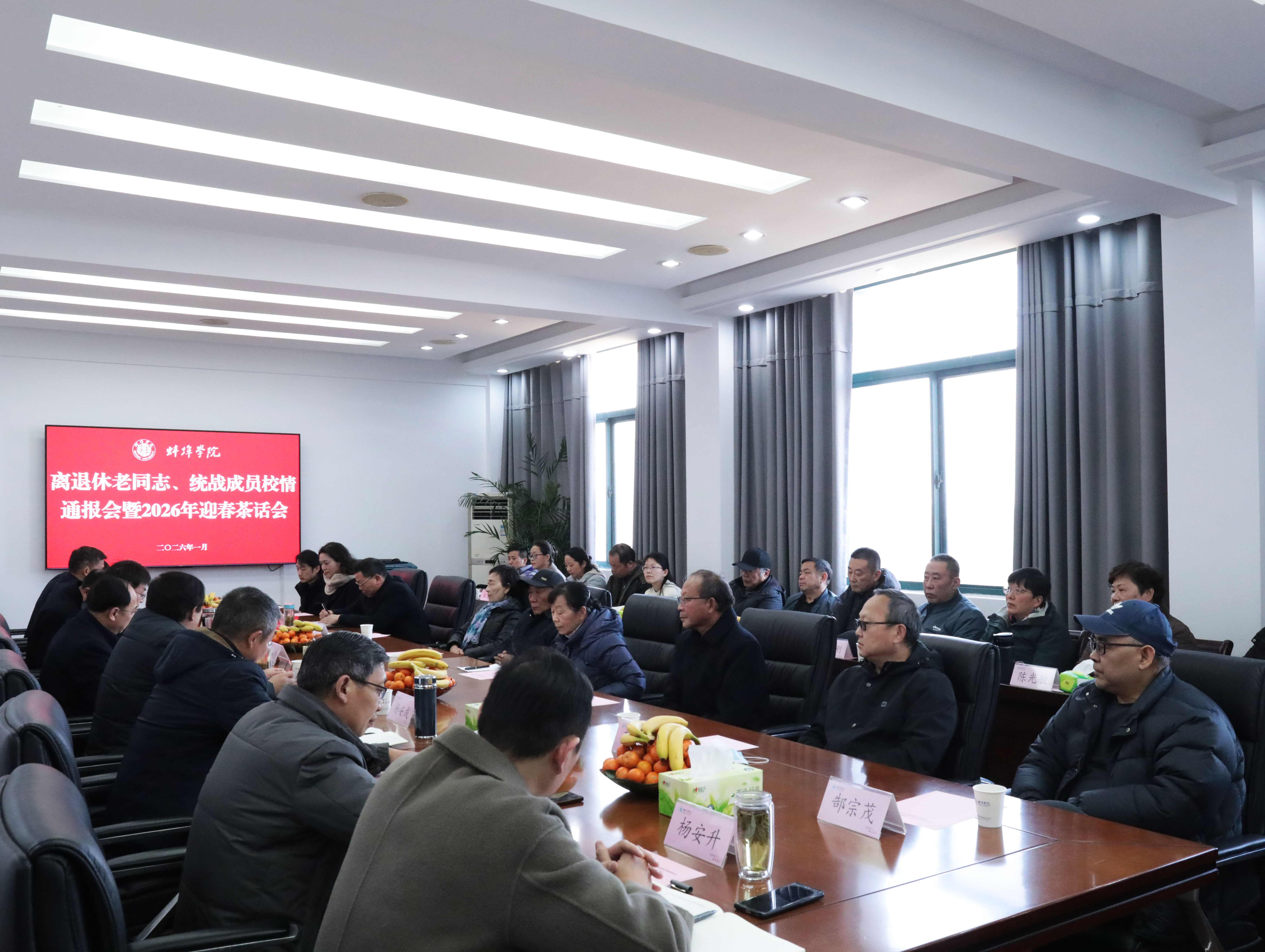 春临岁首,情暖校园。1月15日,学校召开离退休老同志、统战成员校情通报会暨2026年迎春茶话会,畅叙情谊,共谋发展。全体校领导出席会议,离退休老同志和统战成员代表、学校相关部门负责同志参加会议。会议由党委副书记韦文联主持。