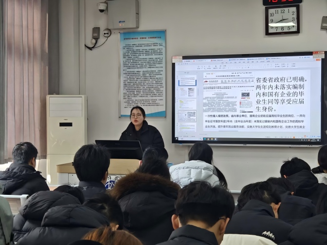 随后,2026届毕业班辅导员围绕就业工作作专项提示,分析了当前行业就业形势及班级就业现状,梳理了考研、考公、企业就业及基层服务项目等多元发展路径,提醒学生关注各渠道报名节点;同时帮助学生纠正就业过程中的认知偏差,提醒从正规渠道获取就业信息,再次强调实习、就业安全要求,引导学生维护自身权益、防范求职及实习风险。