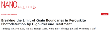 尹延峰长期从事卤化物钙钛矿载流子的光电转换动力学研究。近期,他以第一作者身份在NanoLetters(中国科学院化学类一区,影响因子9.1,Top期刊)、JACSAu(中国科学院一区,影响因子8.7,Top期刊)两大国际权威期刊发表重要成果。研究围绕高压处理技术对钙钛矿薄膜的结构与性能调控展开,通过高压处理,成功优化材料晶界结构、强化内部氢键作用,显著提升了钙钛矿材料的载流子输运能力与环境稳定性,为高性能、高稳定钙钛矿光电器件的研发提供了全新技术路径,相关成果具有重要的学术价值与应用前景,也直接助力我校电子信息学科在前沿光电材料与器件方向上的特色发展。