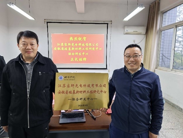 在前期合作的基础上,双方正式建立“江苏容轩光电科技有限公司、安徽省硅基新材料工程研究中心联合研发中心”。院长葛金龙与高维海共同为研发中心揭牌,标志着双方合作迈入全新阶段。此外,还聘任高维海、李鸣为学院校外企业导师,旨在为材料科学与工程专业培养更多高质量的应用型新工科人才。