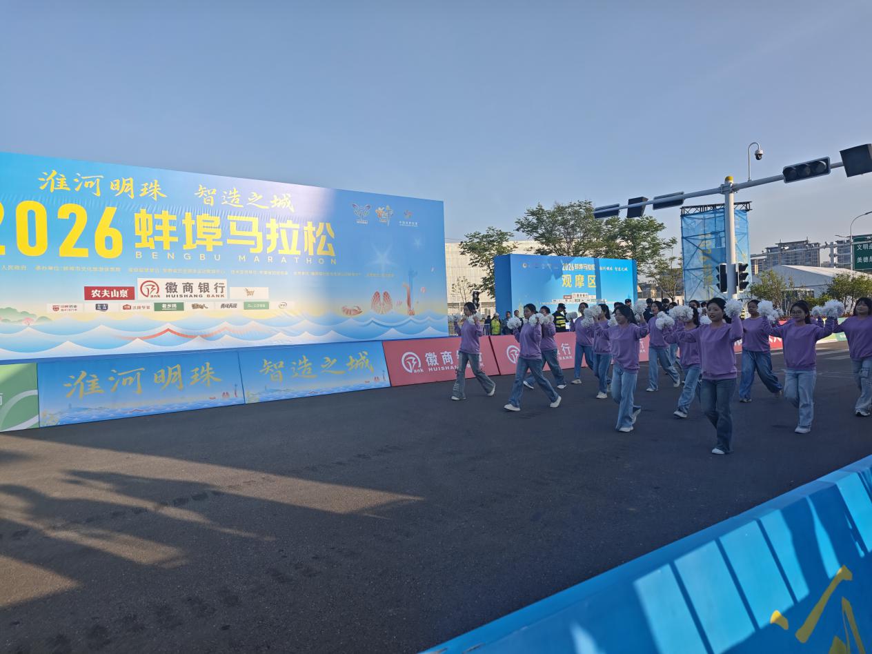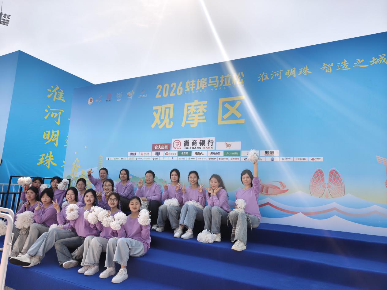 近日,2026年蚌埠市马拉松赛事火热开跑。受组委会邀请,蚌埠学院啦啦操队亮相赛事现场,以青春活力为全体跑者加油助威,成为赛道旁一道亮丽的风景线。