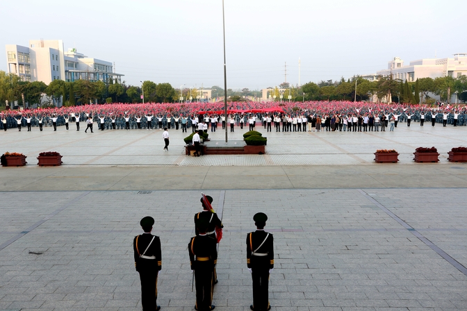 按照千万大学生“青春告白祖国”工作部署视频会会议精神,结合我校实际,2019年9月30日,我校在图书馆广场隆重举行庆祝新中国成立70周年升旗仪式,党委书记刘泽功、校长丁明、副校长郑桂富、纪委书记赵大为、副校长郭有强出席仪式,各部门主要负责人,各教学院部党组织书记、团总支书记,马克思主义学院全体教师,民主党派代表,2019级新生辅导员、学生干部代表、2019级全体新生参加仪式。