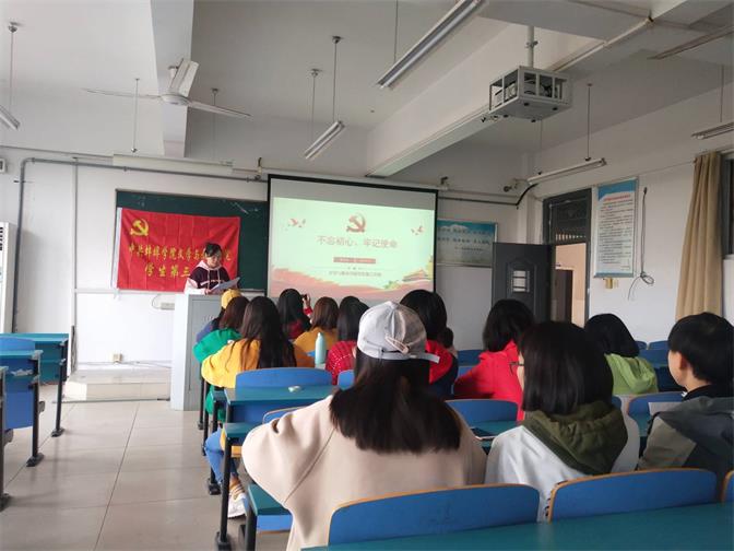 为深入贯彻落实学院“不忘初心、牢记使命”主题教育实施方案,11月6日,文学与教育学院学生第三党支部于教学楼b314开展了支部书记上党课活动。支部书记黄宇琛围绕“不忘初心,牢记使命”这一主题,开展主题党课教育。