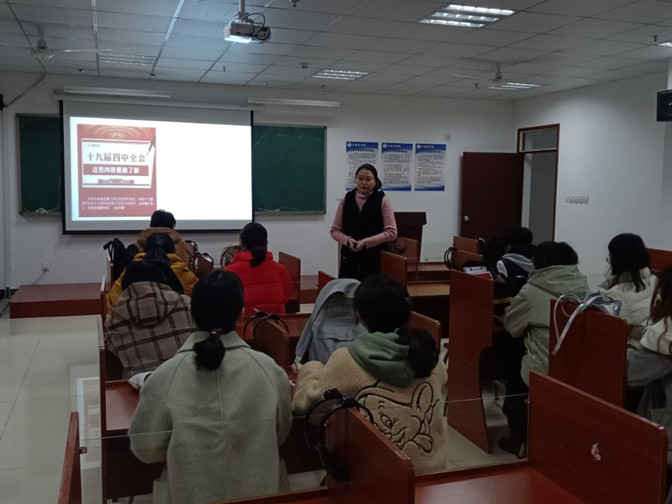 1128日外国语学院学生党支部在综合楼F506开展“学习十九届四中全会,争做合格共产党员”的主题党课,学生支部书记吴婷婷主讲,全体学生党员参加。