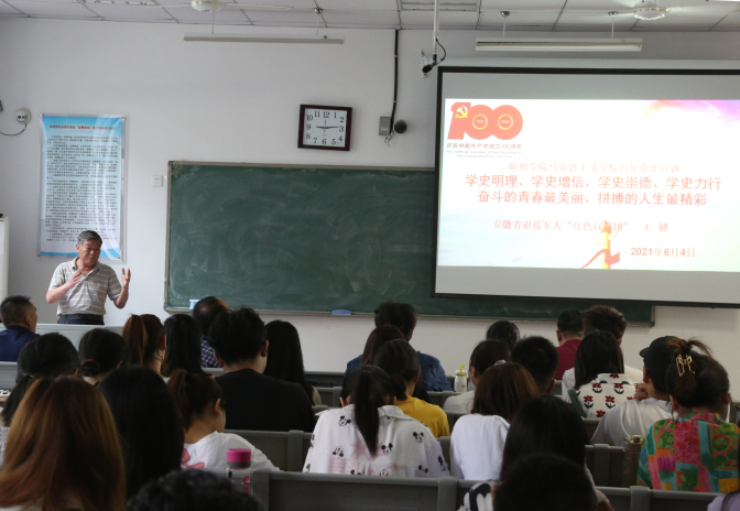 6月4日上午,蚌埠学院举办党史学习教育暨道德讲堂“英雄模范进校园”活动。安徽省关心下一代“十佳五老”提名奖获得者、“全省优秀党建工作指导员”、2020年安徽省“最美退役军人”、安徽省退役军人“红色宣讲团”成员王健应邀走进蚌埠学院,给师生们带来了一场党史学习教育报告会。报告会由校党委委员、宣传部长、党史学习教育领导小组办公室主任李荣主持,马院全体教师、大学生党史学习教育宣讲团成员、青马工程学习骨干等参加了报告会。