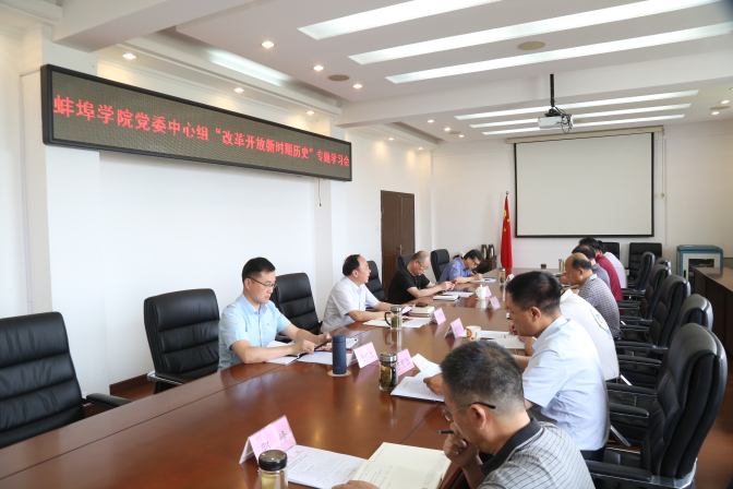 根据省委党史学习教育安排和学校党史学习教育专题学习计划,6月10日,蚌埠学院党委理论学习中心组在行政楼第二会议室举行“改革开放新时期历史”专题学习会。省委党史学习教育第五巡回指导组成员权良胜、许祝生到场指导专题学习会。学校党委理论学习中心组成员参加学习会。学习会由党委书记陈国龙主持。