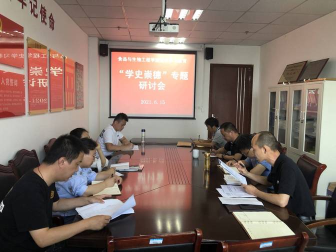 6月15日下午,食品与生物工程学院党史学习教育班开展第三次专题“学史崇德”研讨会,进一步深化巩固党史学习教育成效,班子成员、支部书记、教学秘书和团总支书记参加会议。