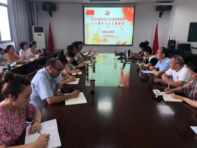习近平总书记“七一”重要讲话精神全面回顾我们党为了实现中华民族伟大复兴,带领中国人民开辟的伟大道路、创造的伟大事业、取得的伟大成就,系统总结伟大建党精神和党的百年光辉历程中创造的宝贵经验,并对当前及未来一个时期的工作作出重要部署。作为高校思想政治教育的主渠道、主阵地,马克思主义学院第一时间召开全体教师会议,确定“学中思行中悟悟中讲”学习主基调,要求把学习贯彻习近平总书记“七一”重要讲话精神作为当前和今后一个时期的重大政治任务,作为党史学习教育的核心内容,切实把思想和行动统一到重要讲话精神上来。