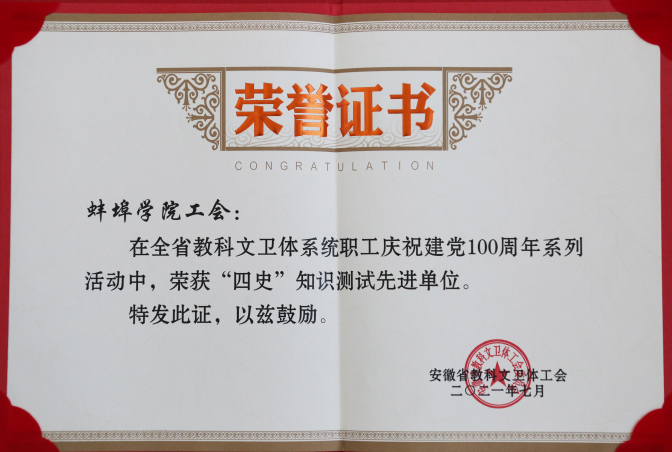 为深入贯彻习近平新时代中国特色社会主义思想和习近平总书记在党史学习教育动员大会上的重要讲话精神,喜迎中国共产党成立100周年,激励广大教职工更加紧密地团结在以习近平同志为核心的党中央周围,奋进新征程、再创新辉煌,安徽省教科文卫体工会下发了《关于组织开展“中国梦·劳动美·心向党”喜迎中国共产党成立100周年系列活动的通知》,校工会高度重视此项工作,采取多种措施推进工作开展,各基层分工会广泛宣传,积极动员教职工参与省教科文卫体工会组织的网上“四史”(党史、新中国史、改革开放史、社会主义发展史)知识测试。形成了党员干部带头,群众参与的学“四史”、测“四史”的热潮。根据教职工参与情况和专家评审、网络投票等评选方式,最终我校工会荣获全省教科文卫体系统职工庆祝建党100周年系列活动“四史”知识测试先进单位;毛星懿作品《乘奔御风,载欣载奔》荣获主题征文活动二等奖,刘斯文作品《奋斗的青春最美—安徽省最年轻劳模的匠心》荣获主题征文三等奖。