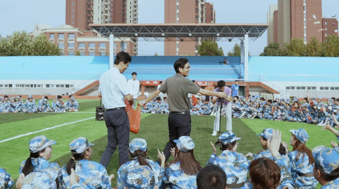 由学院领导、辅导员自掏腰包为全体2021级新生购买的近1700斤水果整齐摆放在操场上,三百余名新生有序围坐成 “同心圆”,取中秋团圆之意,其乐融融、共聚联欢。伴随着热烈的欢呼声,院党总支书记袁飞、院长张自军、副院长姚保峰入场致辞,并在满场热烈的气氛中为新生们分发各种水果和糖果。品尝谈笑间,这些看似简单、朴素的节日小食,却最为适宜地传递出了学院对新生们的殷切关怀与浓浓心意。