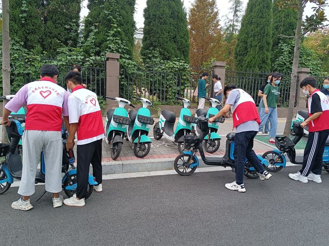 早上身着红色志愿者服装的党员志愿者在学生第二党支部书记闫利萍和学生第四党支部书记韩卓的带领下在学校北门集合。志愿者们将北门同学们使用率较高,但是因各种原因未归置到位的共享单车、共享电单车摆放整齐。将停放在马路上的单车放到规定位置,不仅更加方便大家出行使用,更排除了道路安全隐患,为城市环境提升做一份贡献。