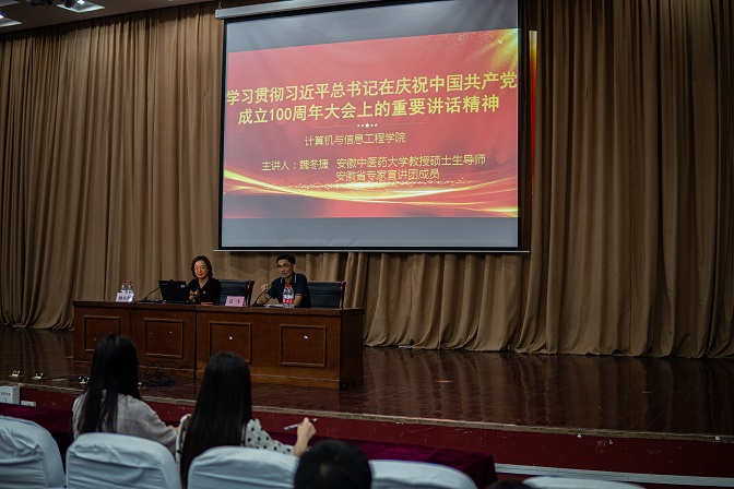 928日晚7点整,校学术报告厅内座无虚席、秩序井然。为学习贯彻习近平总书记七一重要讲话精神,教育引导广大新生学史爱党、知爱国,厚植家国情怀,扣好人生第一粒扣子,应计算机与信息工程学院邀请,安徽省委讲师团专家宣讲团成员、安徽中医药大学马克思主义学院教授魏冬捷为学院刚刚结束军训的2021级全体新生作“学习贯彻习近平总书记在庆祝中国共产党成立100周年大会上的重要讲话精神”专题宣讲报告。报告会由计算机与信息工程学院党总支书记袁飞主持,院领导班子、党支部书记、辅导员、教师代表及全院大一新生参加。