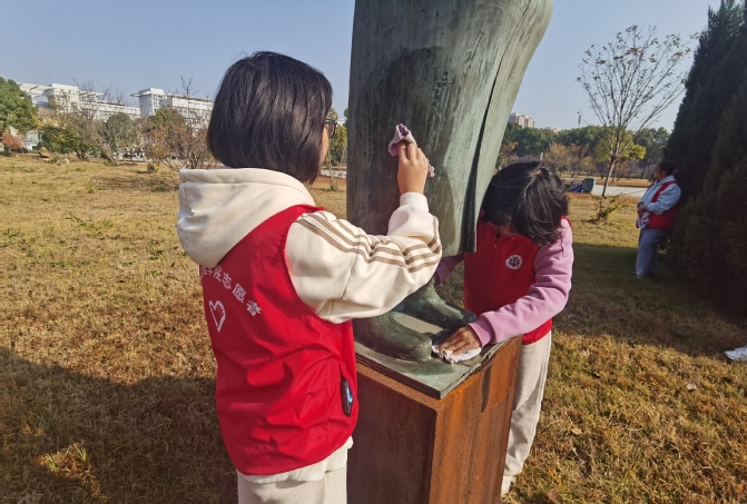 为引导广大学生向雷锋同志学习,弘扬“奉献、友爱、互助、进步”的志愿服务精神。11月24日,外国语学院开展了校园雕塑清洁活动。