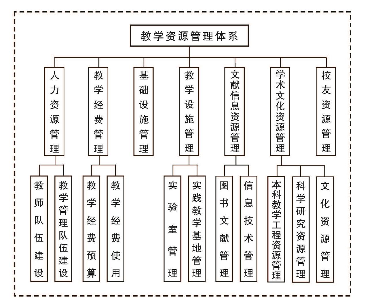 第九条 教学资源管理体系。教学资源管理包括人力资源管理、教学经费管理、基础设施管理、教学设施管理、文献信息资源管理、学术文化资源管理和校友资源管理。其结构如下: