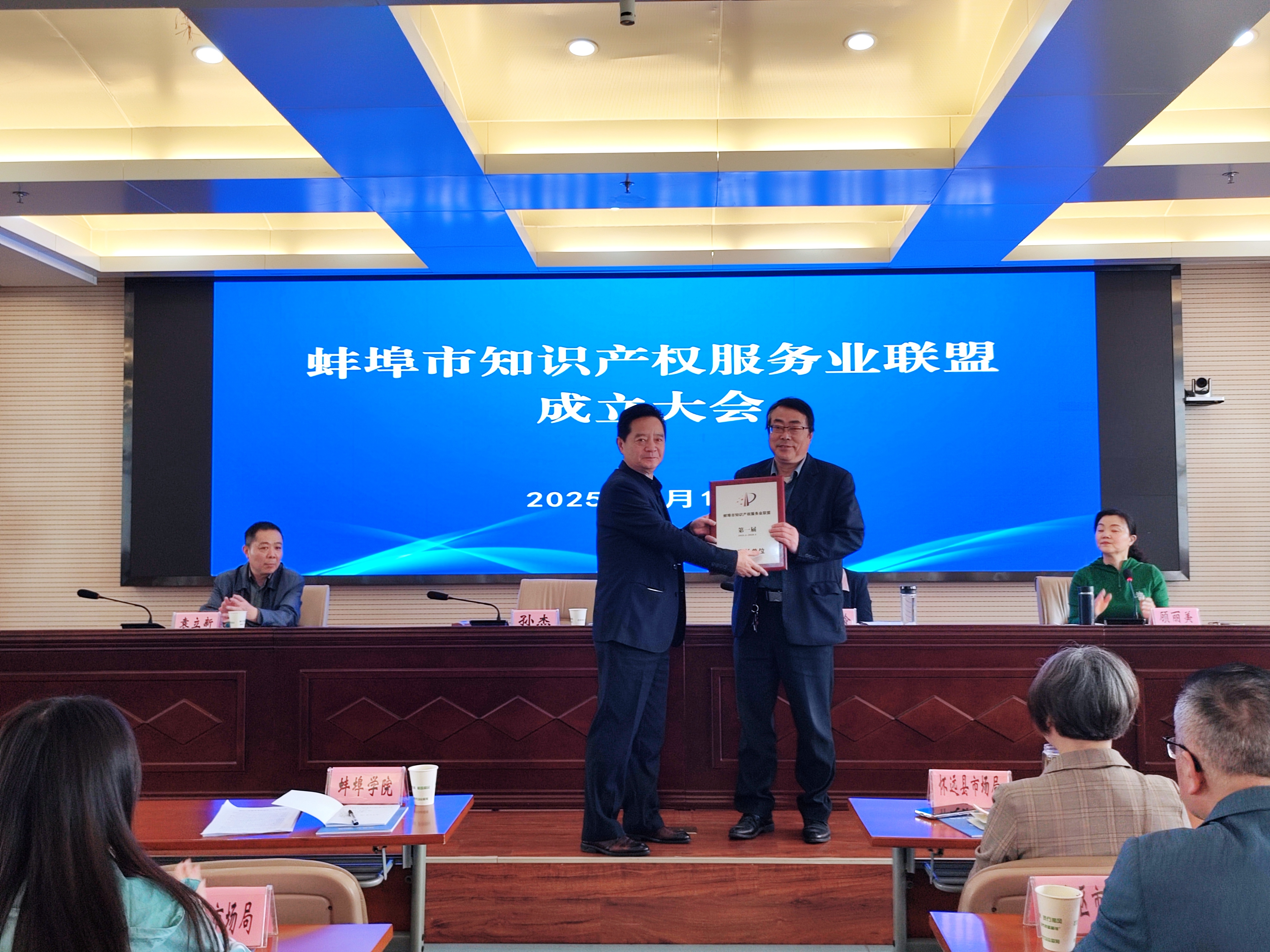 会上审议并通过了《蚌埠市知识产权服务业联盟公约》《蚌埠市知识产权服务业联盟理事长单位职责》,推选蚌埠学院为首届理事长单位,标志着蚌埠学院在知识产权服务工作上迈出了坚实的新步伐。仪式上,安徽省知识产权局公共服务处处长、一级调研员孙杰为蚌埠学院授牌,未来我校将切实履行责任,搭建产学研合作桥梁,推动知识产权服务与产业需求精准对接,聚焦知识产权创造、运用、保护、管理全链条,推动资源共享与优势互补,为蚌埠市高质量发展注入强劲动能。