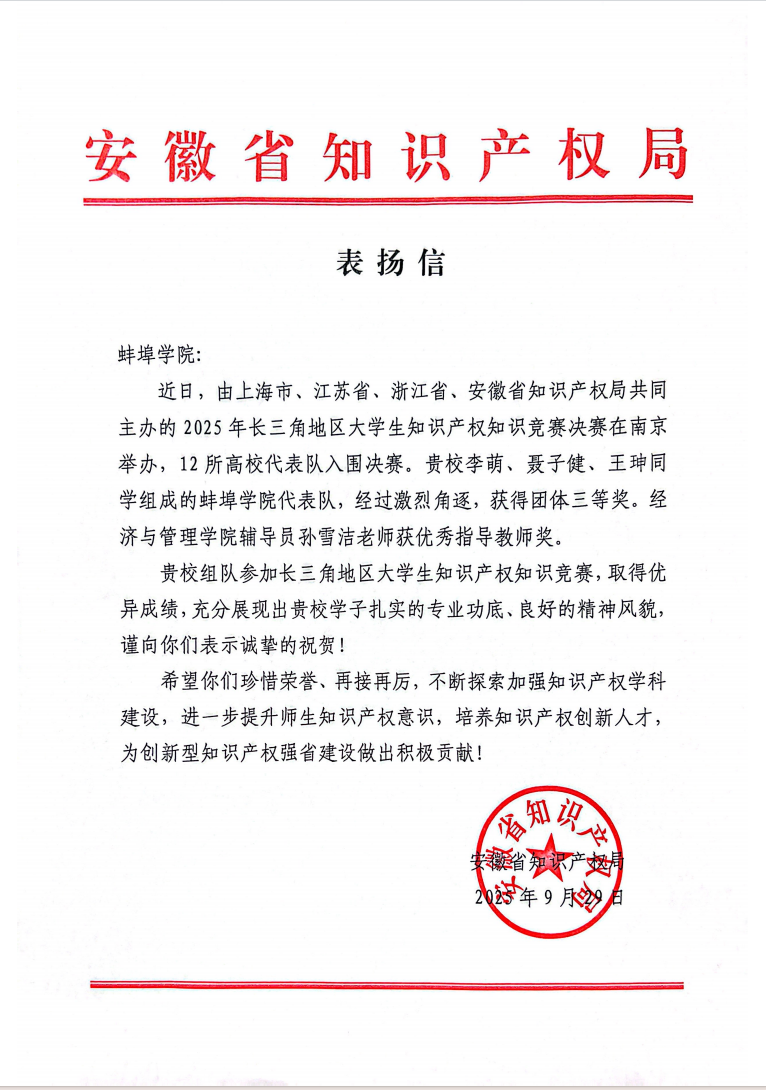 赛后,安徽省知识产权局向我校发来表扬信,高度肯定我校学子展现的扎实专业功底与良好精神风貌,并致以诚挚的祝贺!