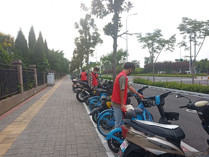 本次活动以清洁美化校园,营造一个干净整洁的,学习环境为目的。天气炎热也阻挡不了志愿者们的热情,志愿者一边摆放车辆,一边积极劝导来往的同学规范摆放自行车。同时,参与清理校园的志愿者们手拿扫帚等工具认真清洁地面,打扫校园角落里的垃圾。志愿者们认真负责,满头汗水,更好的将志愿精神落到了实处。
