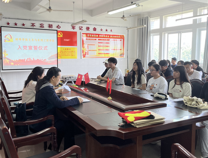 6月6日,土木与水利工程学院党委在学院党员活动室举行新党员入党宣誓仪式,学院党委副书记芦永萍、学生党支部书记、全体新发展党员和部分学生党员代表参加宣誓仪式。