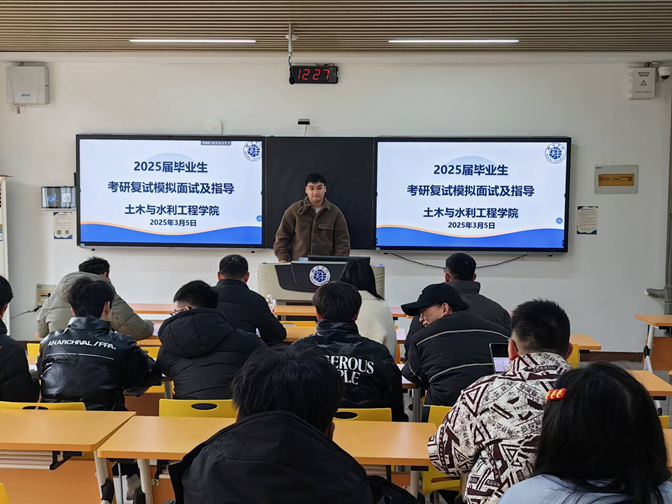 为帮助考研学子增强复试信心,2025年3月5日,土木与水利工程学院水利水电工程教研室联合水利工程教工党支部在B122和B124教室成功举办了2025届水利水电工程专业毕业生考研复试模拟面试及指导。本次活动由学院精心策划,教研室和党支部组织了8位专业教师担任评委,为考生提供全面的模拟训练和针对性指导。活动由教研室主任杨兰主持,毕业班辅导员徐丹丹和考研上线学生参加了此次活动。