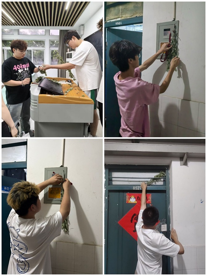 同学们积极响应,纷纷行动起来,对宿舍进行了彻底的打扫。大家分工协作,清理垃圾、擦拭家具、整理物品,将宿舍打扫得干干净净。此次宿舍卫生清扫活动,同学们不仅营造了整洁舒适的居住环境,还培养了良好的卫生习惯,增强了宿舍成员之间的团结协作精神。学院还向全院宿舍发放了艾草,艾草作为端午节的传统元素之一,具有独特的香气和药用价值。同学们将艾草悬挂在宿舍门口或窗边,清新的艾草香气弥漫在空气中,不仅是一种传统的习俗,更是一种对健康生活的追求。