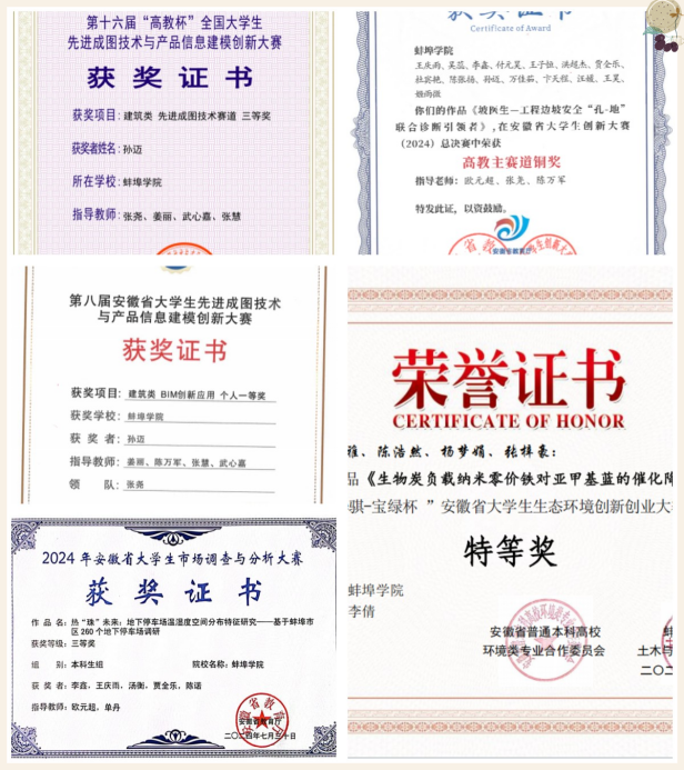 学院以智固本,提智育人,积极组织学生参加各类学科竞赛和创新创业活动,构建“以赛促学、以赛促创、以赛促用”育人模式,形成覆盖“校级省级国家级”的三级竞赛培育机制,实现人才培养质量跨越式提升。近年来,学科竞赛取得国家级奖项12项、省级奖项72项,大学生创新创业训练项目立项国家级28项、省级50项。鼓励引导和组织师生积极参加各类学术含量较高的竞赛,强化竞赛的统筹与组织,在“高教杯”全国大学生先进成图技术与产品信息建模创新大赛、“挑战杯·华安证券”安徽省大学生课外学术科技作品竞赛、大学生节能减排社会实践与科技竞赛、安徽省乡村振兴创新创业大赛等赛事中,学生团队屡创佳绩、硕果累累,充分展示了学院在智育培养方面的显著成效。