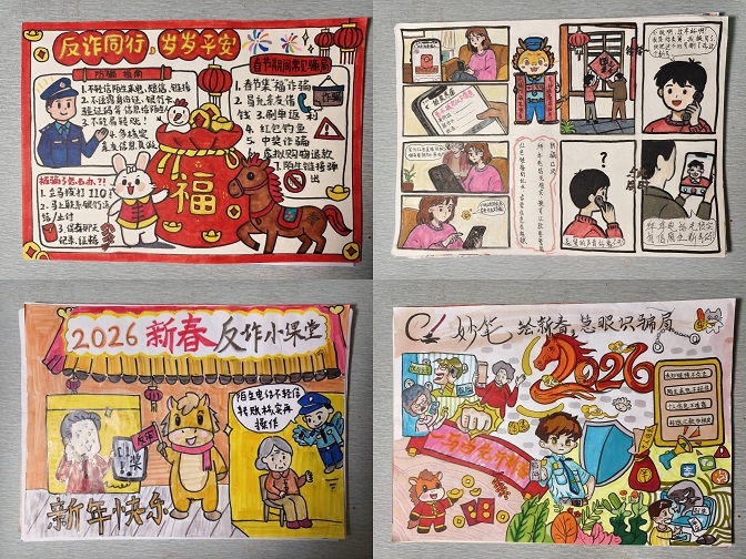 本次比赛紧扣反诈核心,鼓励同学们以手绘为载体,将反诈知识与艺术创作相结合,深入剖析常见诈骗套路、普及科学防骗技巧。大赛设置骗局警示类、防骗指南类、平安祝福类三大创作主题。自活动通知发布以来,同学们积极参与,共收到作品近20项。参赛作品主题鲜明、立意新颖,内容积极正向、感染力强,兼具艺术观赏性与反诈宣传教育价值,充分展现了大学生们良好的安全素养与创作风采。