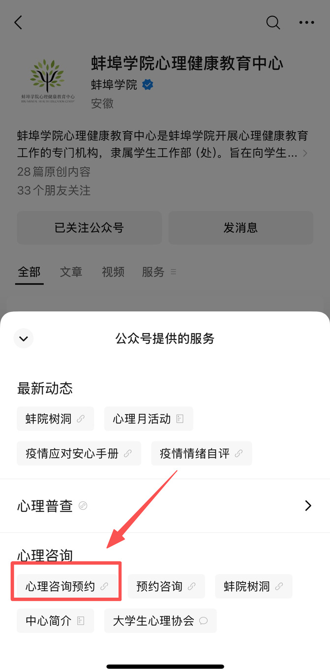 方式一:关注微信公众号【蚌埠学院心理健康教育中心】,点击底部菜单栏[心理咨询]-[心理咨询预约]一填写咨询预约登记表。