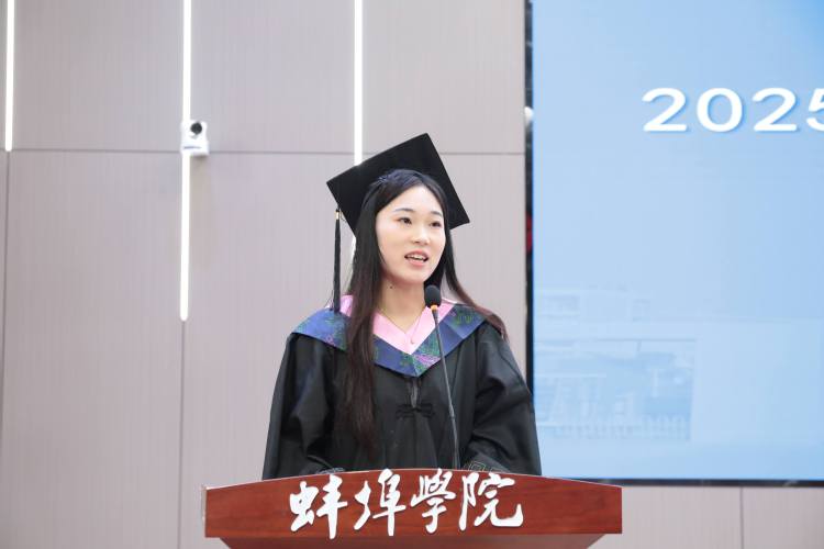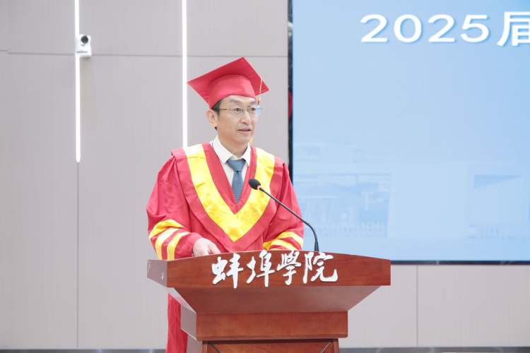 张亚新在致辞中深情回顾2025届学子与学校共成长的四年历程,对同学们在学业科研、创新创业、志愿服务等方面的优异成绩给予高度肯定。面向新征程,他提出四点期望:一要保持勤学善思的状态,做一个志存高远的追梦者,将个人理想融入中华民族伟大复兴征程;二要保持踔厉奋发的姿态,做一个笃行不怠的开拓者,勇做时代前列的奋进者、奉献者;三要坚持兢兢业业的常态,做一个脚踏实地的建设者,践行校训精神,服务国家发展所需;四要保持乐观向上的心态,做一个超越自我的孤勇者,在挫折中向下扎根,于拼搏中向上生长。他特别叮嘱毕业生铭记“1128”(校园面积)寓意一帆风顺、一鸣惊人,“1866”(校门牌号)象征母校永远是精神港湾,他深情表示:“蚌埠学院是你家,你曾从这里出发!”