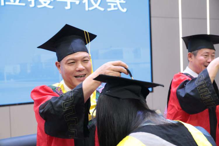 郭有强宣读学位授予文件,校领导与学位评定委员会委员为毕业生代表拨穗正冠、颁发证书。