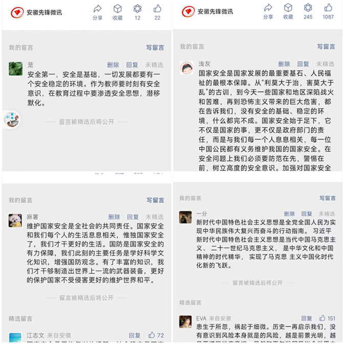 本次活动,所有党员在前期自学的基础上,突出充分运用好微信公众号等线上平台载体,联动应用技术学院两个支部将分散各地的党员齐聚云端开展线上学习讨论。活动要求全体党员及时关注“安徽先锋有声书”“主题教育有声书”等党员教育平台微信公众号,组织开展“微讨论”、“微心得”线上交流情况。各党支部书记每日及时转发平台推送的主题教育学习资源,党员每日做好相关内容阅读学习。所有党员同志于上周五开展线上“微心得”讨论交流活动,所有党员将该段时间的学习心得、感悟、收获发至党支部群,大家进行线上微讨论。